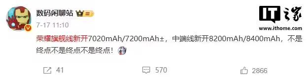 值得注意的是,@数码闲聊站早前还透露过荣耀的产品规划,其中旗舰系列将引入7020mAh至7200mAh±的电池配置,而中端系列则计划采用8200mAh至8400mAh的电池,并且暗示这些并非最终的电池容量上限。
