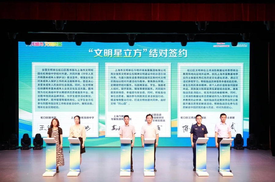 “线”上串联,构建多元共建联动网络。虹口区通过“文明星立方”结对共建项目,推动文明单位与校园、居民区新时代文明实践站、爱教基地等多元主体联动合作,形成“传播星、守护星、服务星”三大服务板块,延伸文明单位服务半径。上海今明环境发展集团有限公司与嘉兴路街道香港丽园居民区新时代文明实践站建立结对机制,推动了社区志愿服务项目,为居民提供理发、维修等实用服务,并通过结对帮扶帮助困难家庭、学生和独居老人,提升社区居民的幸福感与归属感。虹口区图书馆与北虹高级中学结对共建,开展普法宣传,增强全社会对未成年人保护工作的关注度,共同营造关心关爱未成年人的良好社会氛围。
