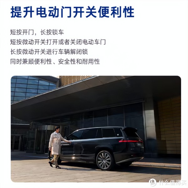 平时我们手上拿的东西太多,电动门如何开启更便捷呢?腾势N9升级电动门开关便利性,短按即是开门,长按则是锁车,短按微动开关打开或者关闭电动门,在“微动开关”的作用下,高效完成各种指令,提升电动门开关便利性。